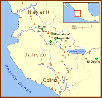 Uma vez que o México ocidental se encontra mesmo na periferia da Mesoamérica, é desde há muito considerado como estando fora da principal corrente mesoamericana e atualmente as suas culturas parecem estar particularmente isoladas de muitas das principais influências mesoamericanas.[41] Por exemplo, não foram recuperados nos túmulos de poço quaisquer artefactos com influência olmeca, nem tão pouco evidências de qualquer calendário ou sistema de escrita mesoamericanos,[42] embora estejam presentes alguns marcadores culturais mesoamericanos, sobretudo o jogo de bola mesoamericano.