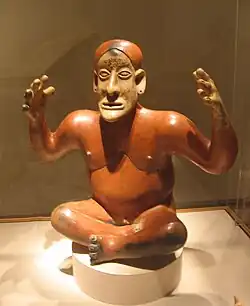 - As figuras do estilo "Chinesco" foram assim designadas pelos negociantes de arte devido à sua suposta aparência chinesa. Um tipo antigo, o "chinesco" é identificado com Nayarit [18] e foram identificados até cinco subgrupos principais, embora exista uma sobreposição considerável entre eles.[19] As figuras do tipo A, as do chamado "Chinesco clássico",[20] são representações realistas. Um curador proeminente, Michael Kan, diz que o "seu exterior subtil e calmo, sugere emoção em lugar de demonstrá-la".[21] Estas figuras do tipo A são tão semelhantes entre si que foi sugerido que se trataria da produção de uma única "escola".[22] Os tipos B até E são mais abstratos, caracterizados por olhos rasgados e inchados fundidos na face, e largas cabeças retangulares ou triangulares. Estas figuras apresentam-se muitas vezes em poses sentadas ou reclinadas, com pernas bulbosas e encurtadas que afunilam até um ponto.[23]