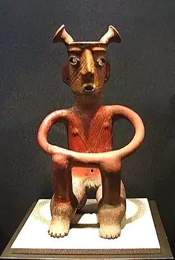 - Os cães de cerâmica são amplamente conhecidos a partir de túmulos saqueados de Colima. Geralmente, nas culturas mesoamericanas acreditava-se que os cães representavam guias das almas dos mortos[31] e vários cães de cerâmica ostentam máscaras humanas.[32] Outrossim, deve notar-se também que os cães eram frequentemente uma das principais fontes de proteína animal na antiga Mesoamérica.[33]