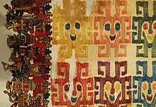 O "tecido de paracas", um tecido lindamente preservado do período intermediário inicial (300 a.C.-100 a.C.), é um dos melhores tecidos conhecidos desse povo. Este tecido, também conhecido como BMT (Brooklyn Museum Textile), está na coleção do Brooklyn Museum. O manto mede 62x148 cm e é trabalhado em fibras de algodão e camelídeo com diversas técnicas. A parte do meio é uma malha de gaze muito fina, provavelmente tecida em um tear de tiras traseiras em uma teia de quatro ourelas típica com urdidura e trama de algodão. Esta teia central é padronizada com 32 cabeças raiadas repetidas em seis cores diferentes. A coloração foi conseguida pelo meticuloso método de embrulhamento de urdidura, onde a urdidura é coberta em seções com lã de camelídeo tingido. O tecido liso sobre as áreas envoltas cria um tecido de dupla face, que se espelham perfeitamente. A simetria absoluta do desenho é quebrada nas bordas longas, onde um lado tem motivos espirais extras e o outro termina com triângulos escalonados. Dobrar o tecido semitransparente no sentido do comprimento aproximaria essas bordas, formando o desenho da fricção escalonada, elemento amplamente utilizado nos desenhos andinos e mesoamericanos.[14]