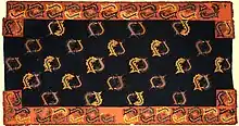A barra tridimensional é uma procissão colorida de 90 personagens coloridos altamente detalhados e é trabalhada em fio de camelídeo pelo método de laçada em malha cruzada. Guerreiros ou senhores com parafernália de guerra, mulheres e xamãs com a adição de duas lhamas estão caminhando ao redor da borda em uma faixa vermelha, que é presa à teia central com flores coloridas repetidas ritmicamente. As costas e as frentes das figuras são imagens espelhadas, exceto por três figuras.[14] Ao lado das figuras há uma abundância de vegetação representada, o que é característico dos trabalhos têxteis nascas.[15] A orla tridimensional anexada à seção média leve sugere que este manto nunca foi pendurado e muito provavelmente era usado colocado no chão servindo como um campo de adivinhação. Lois Martin, que estudou extensivamente o manto, sugere que talvez ele fosse usado como um calendário para registrar o tempo dos rituais.[16]
