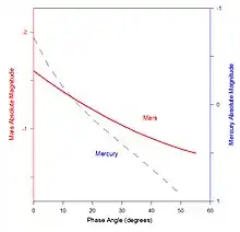 Apenas aproximadamente 50° da curva de fase de Marte podem ser observados da Terra, porque sua órbita é mais distante do Sol que a do nosso planeta. Há um efeito da oposição, mas ele é menos pronunciado que o de Mercúrio. A rotação de pontos da superfície brilhantes e escuros ao longo do seu disco e variações do estado de sua atmosfera (inclusive suas tempestades de poeira) provocam variações na curva de fase. R. Schmude[19][20] obteve muitas das medições de brilho usadas em uma abrangente análise da curva de fase realizada por A. Mallama.[18]