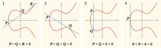 O grupo acima se pode descrever geométrica e algebricamente. Dada a curva sobre o corpo (cuja característica assumimos que não é nem 2 nem 3), e os pontos e na curva, assumimos primeiro que . Seja , já que é um corpo, está bem definido. Então podemos definir mediante