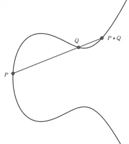 Agora, vamos definir o , o qual facilmente é provado como elemento neutro. Assim, seja a reta que passa por e e seja o terceiro ponto ponto de interseção com a curva. Seja um ponto tal que a reta que passa por e por intersecta a curva no ponto denotado por . Assim, teremos que . Veja na Figura 2 a seguir.