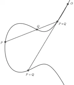 Se adicionarmos um ponto "ao infinito", obteremos a versão projetiva de tal curva. Se temos dois pontos da curva, e então podemos descrever de forma unívoca um terceiro ponto que seja a intersecção da curva com a linha que atravessa aos dois pontos e . Se a linha é tangente à curva em um ponto, então esse ponto contará duas vezes; e se a linha é paralela ao eixo , definimos o terceiro ponto como o "no" infinito. Então justo uma de tais condições será a que cumpra qualquer par de pontos de uma curva elíptica.