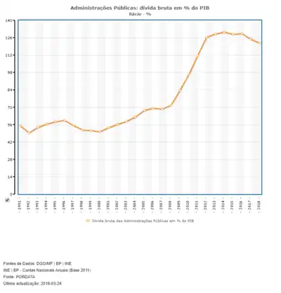 Em relação à dívida pública portuguesa, houve dois períodos, desde princípios dos anos 90, em que a dívida pública de Portugal teve um crescimento acentuado. O primeiro foi no princípio do terceiro milénio; ou seja, a partir do ano 2000 a dívida pública portuguesa começa a ter um crescimento, que muitos economistas consideraram preocupante, que viria no seu entender a contribuir para criar no país uma crise estrutural. Todavia, o grande salto que se faz na dívida pública, em paralelo com o resto da Europa, é no período pós-2008, ou seja, após a crise internacional da Grande Recessão iniciada em 2008, que provocou a crise das dívidas soberanas.