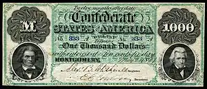 A primeira série de papel-moeda confederada, emitida em março de 1861, gerou interesse e teve uma circulação total de $1,000,000.[2] Quando a guerra começou a pender contra os Confederados, a confiança no sistema monetário do novo país entrou em declínio e o governo tentou salvar a economia ao inflacionar a própria moeda, imprimindo milhares de notas sem lastro. Ao final de 1863, o dólar confederado era cotado a apenas seis centavos em ouro, e continuou em queda.[3]