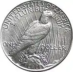 O público acreditou que o design anunciado, que incluía uma espada quebrada, era ilustrativo da derrota, e a Casa da Moeda agiu rapidamente para remover a espada.[3][4][5][6] O dólar da paz foi produzido pela primeira vez em 28 de dezembro de 1921.[7]