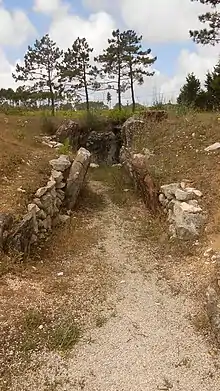 Está edificado no cume da serra, sobre uma colina que é ela também um monumento funerário, no caso uma mamoa.