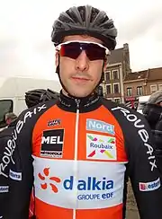 ![]() Daan Myngheer durante a saída da primeira etapa do Tríptico des Monts e Castelos de 2015 em Antoing. | |