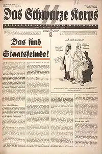 Das Schwarze Korps era o jornal oficial da Schutzstaffel (SS), publicado toda quarta-feira e distribuído gratuitamente. Era solicitado a cada membro da SS que o lesse e também incentivasse outras pessoas a fazer o mesmo. O chefe da redação era Gunter d'Alquen e o editor era Max Amann, diretor da Franz-Eher-Verlag (Central de publicações do Partido Nacional Socialista). O jornal hostilizava vários grupos, frequentemente publicando artigos condenando a Igreja Católica (denunciando atos de "catolicismo político"), os judeus, o comunismo e a franco-maçonaria, entre outros.[1]:242 A publicação mantinha estreita cooperação com o Sicherheitsdienst (serviço secreto da SS), que também exercia significativo controle sobre a linha editorial.