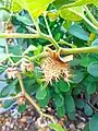 O fruto é uma cápsula ovóide, com cerca de 5 cm de diâmetro, deiscente por 4 válvulas, que, por ser espinhoso, pode ficar preso no pelo ou na plumagem dos animais, facilitando assim a dispersão por zoocoria. As abundantes sementes são discoidais a reniformes, de coloração castanho-alaranjado, com 3-5 mm de diâmetro, comprimidas, foveoladas, com uma espécie de cordão periférico. As sementes podem permanecer no solo sem germinar durante anos se as condições não forem favoráveis.