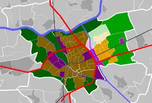 O bairro está dividido em três partes, duas das quais são destinadas à agricultura. A parte sul é composta dos seguintes distritos: (de oeste para leste) Bedrijventerrein Brabantpoort, Hoven, Vlietdijk, Broekland e Watertuinen. Desses distritos, o Bedrijventerrein Brabantpoort é o mais antigo. A norte do lago Waterplas existem mais dois distritos: Lanen e Centrum van de Groote Wielen.
