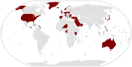 Havia 38 instalações militares americanas de grande e médio porte espalhadas ao redor do globo em 2005 - principalmente bases aéreas e navais - aproximadamente o mesmo número que as 36 bases navais e guarnições do exército britânicas em seu zênite imperial em 1898.[36] O historiador de Yale Paul Kennedy compara a situação dos EUA com a da Grã-Bretanha antes da Primeira Guerra Mundial, comentando que o mapa das bases dos EUA é semelhante ao da Grã-Bretanha antes da Guerra.[35]