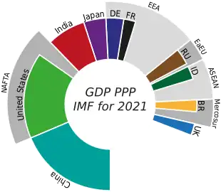 Em 2014, a China ultrapassou os EUA em PIB de Paridade do Poder de Compra, tornando-se a maior potência econômica segundo essa métrica.[20] A revista The Economist argumentou que, por essas e outras razões, o século XXI seria o "Século Chinês".[21] A China também é agora o maior manufaturador do mundo.[22][22] A ascensão da China e de outras nações asiáticas está criando uma mudança do centro econômico geral dos Estados Unidos para a Ásia.[23][24]