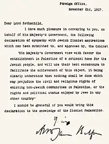 Declaração Balfour é uma carta de 2 de novembro de 1917[1] do então secretário britânico dos Assuntos Estrangeiros, Arthur James Balfour,[1] dirigida ao Lionel Walter Rothschild, Barão Rothschild, líder da comunidade judaica do Reino Unido,[1][2] para ser transmitida à Federação Sionista da Grã-Bretanha. A carta se refere à intenção do governo britânico de facilitar o estabelecimento do Lar Nacional Judeu na Palestina, caso a Inglaterra conseguisse derrotar o Império Otomano, que, até então, dominava aquela região.[3]