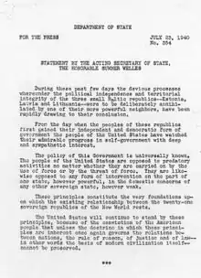 A declaração estabeleceu um não reconhecimento de cinco décadas da anexação. O documento teve grande importância para a política geral dos EUA em relação à Europa no ano crítico de 1940. Os EUA não envolveram os soviéticos militarmente na região, mas a declaração permitiu que os estados bálticos mantivessem missões diplomáticas independentes e A Ordem Executiva 8484 protegeu os ativos financeiros do Báltico. Sua essência foi apoiada por todos os presidentes americanos subsequentes e resoluções do Congresso.[1][2][3][4]