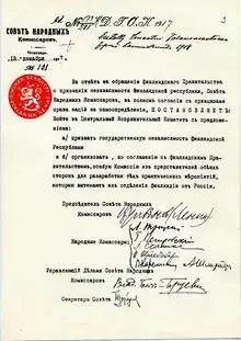 - «First World War.com - Primary Documents - Soviet Recognition of Finland's Independence, 18 December 1917». www.firstworldwar.com. Consultado em 6 de dezembro de 2020
