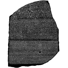 - Pedra 1: Estela de Roseta, chamada "Pedra de Roseta", encontrada 1799. Contém 14 linhas de hieróglifos (texto incompleto), 32 linhas de demótico e 54 linhas de grego antigo. Feita de granodiorito.