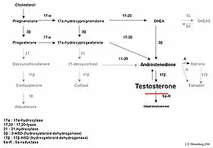 A 5α-redutase tipo 2 (5αR2) é uma enzima, codificada pelo gene SRD5A2, que é expressa em tecidos específicos do corpo masculino desde o desenvolvimento fetal até a idade adulta.[4][6][7] A enzima catalisa a transformação da testosterona (T) em 5α-diidrotestosterona (DHT) intracelularmente. A DHT é o ligante mais potente para o receptor de andrógeno (AR).[8] Após a ligação, o complexo DHT-AR transloca-se do citoplasma para o núcleo e ativa os genes regulados pelo receptor de andrógeno envolvidos em processos que incluem a diferenciação sexual masculina.[9]