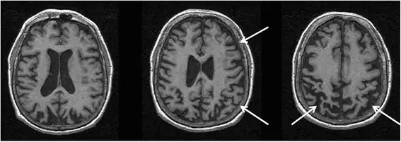 O objectivo da realização de uma tomografia computorizada ou de uma ressonância magnética ao cérebro é excluir uma lesão estrutural, como um tumor, abcesso, hematoma ou enfarte. Na ausência destas lesões, alguns achados podem apoiar o diagnóstico de degeneração corticobasal, como a atrofia cortical assimétrica, especialmente frontoparietal, com a atrofia mais proeminente contralateral ao lado mais severamente afectado clinicamente (Fig. 2).[65][66][67][68][69][70] O ventrículo lateral no hemisfério cerebral mais afectado pode também ser ligeiramente maior do que o oposto. Uma atrofia assimétrica nos pedúnculos cerebrais pode estar presente (Fig. 3).[71] Outros achados de RM relatados na síndrome corticobasal incluem atrofia do segmento médio ou posterior do corpo caloso (Fig. 4),[72] alterações de sinal hiperintensas laterais ao putâmen,[65] atrofia do putâmen,[73] e alterações subcorticais subtis do sinal hiperintenso no córtex motor ± somatossensorial. [74]