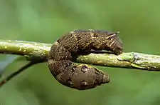 Quando perturbada, a lagarta encolhe a protuberância (tromba) para o interior do seu segmento posterior, o que lhe dá uma aparência de cobra, com uma "cabeça" alargada com quatro manchas semelhantes a olhos.