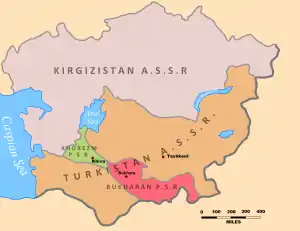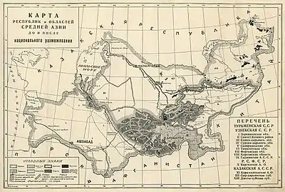 O Turquestão foi oficialmente dividido em duas Repúblicas Socialistas Soviéticas (SSR), o a RSS Turcomena e o RSS Uzbeque . [26] A RSS Turcomena correspondia aproximadamente às fronteiras do atual Turcomenistão e foi criada como um lar para os turcomanos da Ásia Central soviética. As Repúblicas Soviéticas Populares de Bukhara e Khorezm foram em grande parte absorvidas pela RSS uzbeque, que também incluía outros territórios habitados por uzbeques, bem como aqueles habitados por tadjiques étnicos. Ao mesmo tempo, o a RSSA Tajique foi criado dentro da RSS Uzbeque para a população étnica Tajiques [26] e, em maio de 1929, foi separado da RSS Uzbeque e recebeu o status de uma República Socialista Soviética completa (o Tajik SSR ) . [21] [33] O a RSS Quirguiz (atual Quirguistão) foi criado apenas em 1936; entre 1929 e 1936 existiu como o Oblast Autônomo de Kara-Kirghiz (província) dentro da SFSR russa . [34] [26] A RSS do Cazaquistão também foi criada nessa época (5 de dezembro de 1936), completando assim o processo de delimitação nacional da Ásia Central Soviética em cinco Repúblicas Socialistas Soviéticas que em 1991 se tornariam cinco estados independentes.