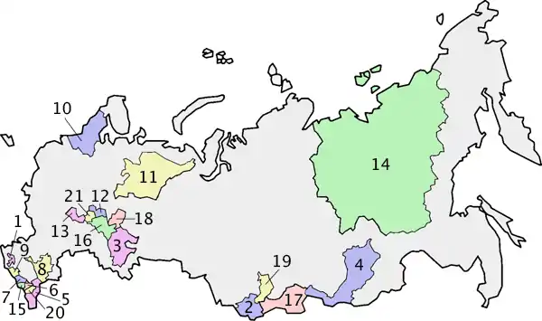 | 8. Calmúquia9. Carachai-Circássia10. Carélia11. Cómi12. Mari El13. Mordóvia14. Sakha (Yakutia) | 15. Ossétia do Norte-Alânia16. Tartaristão17. Tuva18. Udmúrtia19. Cacássia20. Chechênia21. Chuváchia | |