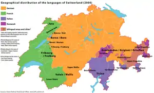 A Suíça possui quatro línguas oficiais: alemão (falado por 5,2 milhões de pessoas, ou 63% da população), francês (falado por 1,9 milhões de pessoas, ou 22,9% da população), italiano (falado por 678 mil pessoas, ou 8,2% da população) e romanche (falado por 44 mil de pessoas, ou 0,5% da população). Cerca de 10% dos habitantes não falam nenhuma das quatro línguas oficiais (a maioria imigrantes). Entre a população imigrante, algumas das línguas mais faladas são servo-croata, albanês, português, macedônio, espanhol, turco e árabe.[8]
