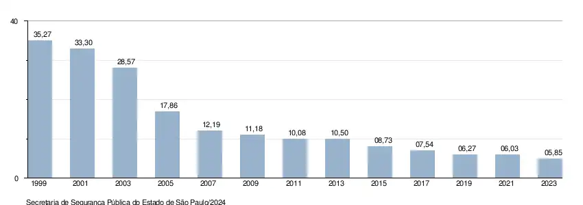 Em 2010, de acordo com dados da Secretaria de Segurança Pública do Estado de São Paulo, o estado alcançou a taxa de 10,47 homicídios por 100 mil habitantes, uma redução de 70,3% em relação ao número registrado em 1999, que foi de 35,27 homicídios a cada 100 mil habitantes. A atual taxa de homicídios do estado está próxima do considerado suportável pela Organização Mundial da Saúde, que é de 10 homicídios por 100 mil habitantes. Outros índices de criminalidade também apresentaram queda no período pesquisado, como o estupro, que teve redução de 75%.[25][26]