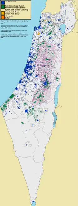 Total: 2.939.418 (estimativa de julho de 2018); 71,72% da população é árabe (predominantemente sunita), 28,28% é judia [8] (cf. Israel: judeus 74%, árabes 21%, outros 5%; e Gaza: árabes 99%) [9]
