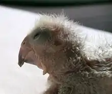 Um filhote de Periquito-da-guiné duas semanas depois da eclosão. O dente de ovo está situado na ponta da parte superior do seu bico.