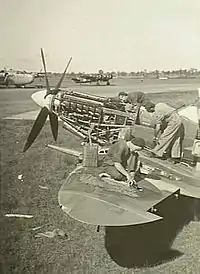 Pessoal do depósito a realizar manutenção num Supermarine Spitfire Mk VIII, em Julho de 1945