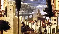 Em primeiro plano está representado com realismo um prado com flores, o que recorda os quadros flamengos da época. Ao fundo vê-se Jerusalém representada de forma geométrica, numa paisagem de céu nublado.