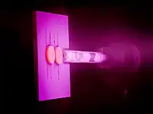 - Deposição por pulverização: Em que uma descarga de plasma brilhante (usualmente localizado em torno do "alvo" por um magneto) bombardeia o material pulverizado um tanto distante como um vapor. Uma animação da ferramenta genérica de PVD por pulverização é vista em: PVD Animation - www.syngraphics.com.