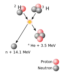 Note que a energia total libertada, 17,6 MeV, é um décimo da da fissão, mas os "ingredientes" da reacção representam apenas uma quinquagésima parte em termos mássicos, pelo que a energia libertada por unidade de massa é superior. No entanto, nesta reacção de fusão, 80% da energia (14 MeV) encontra-se no movimento do neutrão que, por não ter carga eléctrica e por ter quase tanta massa como o núcleo de hidrogénio que o criou, pode escapar sem deixar para trás a sua energia e, portanto, sem sustentar a reacção nem gerar raios X para explosão e fogo.