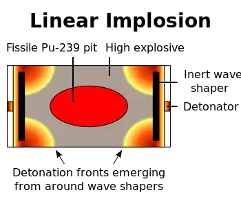 Um desenho implosivo bastante ineficiente é um que simplesmente remodela um ovóide numa esfera, com compressão mínima. Num esquema de implosão linear, uma massa de Pu-239, sólida, não comprimida e alongada, maior do que massa crítica numa esfera, é embutida num cilindro altamente explosivo, com um detonador em cada ponta.[19]