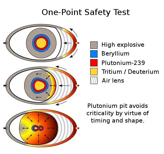 - Montagem implosiva, na qual uma massa físsil de um dos materiais referidos (U-235, Pu-239, ou uma combinação de ambos) é rodeada por uma carga explosiva modelada que comprime a massa, resultando em criticidade.
