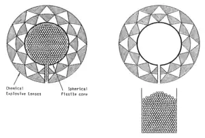 A bomba Fat Man possuía duas conchas esféricas e concêntricas de altos explosivos, cada uma com cerca de 25 cm de espessura. A concha interior guiou a explosão. A concha exterior consistiu num padrão de bola de futebol com 32 lentes altamente explosivas, cada uma convertendo a onda convexa proveniente do seu detonador numa onda côncava cuja frente se adequava à superfície externa da concha interna. Se estas 32 lentes pudessem ser substituídas por apenas duas, a esfera de altos explosivos poderia tornar-se um elipsóide (esferóide prolato) com muito menor diâmetro.