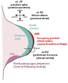 A região de células mesodérmicas que ficam abaixo da CEA é denominada Zona Progressiva caracterizada pela divisão celular que gera o alogamento do broto do membro, a expressão de FGFs no local mantém as células em mitose. O membro é classificado em três regiões de acordo com seu eixo proximo-distal. Durante a divisão, as primeiras células a se dividirem, portanto as primeiras a se diferenciarem, darão origem à estruturas mais proximais, formando a região do estilópodo. As diferenciações mais distais originarão o zeugópodo e o autópodo, sucessivamente[6]. Essas células sofrerão sucessivas divisões na Zona Progressiva, caracterizando sua diferenciação mais distal. Os genes Hox5 estariam relacionados com as especificações inidviduais do eixo proximal-distal do membro[1].