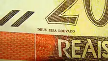 "Deus seja louvado"[nota 1] é uma expressão presente na parte inferior esquerda de todas as cédulas de real atuais no Brasil.[1] Ela existe desde a década de 1980, quando o então presidente da República, José Sarney, católico praticante,[2] solicitou ao Banco Central que fosse incluída na moeda do cruzado. O Governo Federal de então se orientou em doutrinas teístas de outros Estados laicos, como os Estados Unidos da América, que já acrescentavam a frase "In God We Trust" a suas cédulas de dólares.