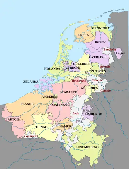 | Ducado de Güeldres | Território integrado nas Províncias Unidas em 1581; exceto uma parte. | |