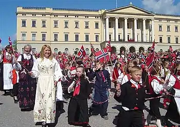 Crianças a comemorar o Dia da Constituição em frente ao Palácio Real de Oslo.