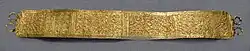A peça, conhecida como Moñes I, que poderá ser dum diadema ou o ornamento dum cinturão de tecido ou couro, faz parte dum conjunto de sete peças semelhantes encontradas no norte das Astúrias e da Galiza, respetivamente no Castro de Elviña, em Riba d'Eu (2), em Cangas de Onís, tesouro Bedoya de origem desconhecida, e de Moñes (2). É formada por uma fina folha de ouro de 0,015 cm de espessura, retangular de 5,4 cm de largura, com pequenos cones soldados na parte superior, dividida em duas faixas horizontais de 2,2 cm com um baixo-relevo representando cenas obtidas por estampagem em que aparecem uma sucessão de guerreiros a pé com um cinturão carregando dois grandes caldeirões ou com duas lanças e a cavalo, armado com punhal e lança, com uma cetra um torque e um elmo de três penachos. E que ilustram bem a citação de Estrabão descrevendo os guerreiros galaicos:
