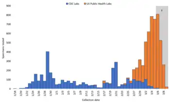 Nos Estados Unidos, os Centros de Controle e Prevenção de Doenças (CDC) desenvolveram o Painel de Diagnóstico por RT-PCR do Novo Coronavírus (2019-nCoV) que foi disponibilizado a laboratórios de saúde pública pela, International Reagent Resource, agência interna dos CDC.[8] Um dos três testes genéticos em versões mais antigas dos kits projetou resultados inconclusivos e um congestionamento em Atlanta; os testes, que utilizavam dois componentes, foram considerados fiáveis em 28 de fevereiro de 2020, permitindo que os laboratórios estaduais e locais finalizassem as análises de forma rápida. Seguidamente, o teste foi aprovado pela Food and Drug Administration sob uma autorização de uso de emergência.[9][10]