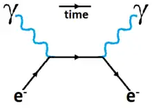 Um processo usualmente utilizado para ilustrar o funcionamento dos diagramas de Feynman é o efeito Compton, onde um elétron e um fóton sofrem um espalhamento elástico (). Neste diagrama, ambos os vértices tem como entrada um elétron real e um fóton real. O elétron absorve o fóton (à esquerda), emitindo um outro fóton (de frequência menor) posteriormente (à direita). Outra maneira de interpretar o processo é considerar que, à esquerda, um fóton e um elétron se aniquilam criando um elétron virtual com diferença na massa e na energia em relação ao elétron inicial. Este elétron tem um tempo de vida muito curto, não violando o princípio da incerteza relativo à energia e tempo. Em seguida, o elétron virtual é aniquilado, dando origem a um fóton e um elétron que caracterizam as partículas que compõem o estado final.