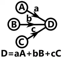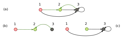 O nó x1 é um nó isolado porque não recebe nenhum fluxo (é considerado uma variável de entrada, ou parâmetro do grafo, podendo todos os nós dependentes serem expressos direta ou indiretamente em função dos isolados); as equações para x2 e x3 têm seus grafos mostrados nas partes (b) e (c) da figura.