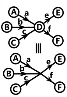 É sempre possível delegar todas as entradas de um nó a um novo intermediário, conectando-o por um fluxo conservativo ao nó antigo. Tal técnica não viola o Teorema da Conservação das Entradas, pois para executar tal modificação no grafo, é necessário cancelar todas as entradas do nó antigo (transformá-lo de dependente para isolado), criar o novo nó e, por fim, conectar o novo nó ao antigo (de isolado para dependente). Ver figura (k).