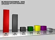 Os votos em uma eleição são frequentemente representados usando gráficos de barras ou gráficos circulares, geralmente etiquetados com a porcentagem ou número de votos correspondente.[1] A distribuição de cadeiras entre os partidos em um corpo legislativo segue um conjunto de regras definido, único para cada corpo legislativo. Por exemplo, o Senado da Virgínia diz: