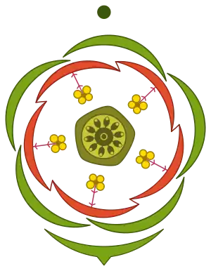 | Diagrama floral parcial da inflorescência de Theobroma cacao (segundo o método de Ronse De Craene). Fórmula floral: ✶ K5 C5(5°+52) G(5) |